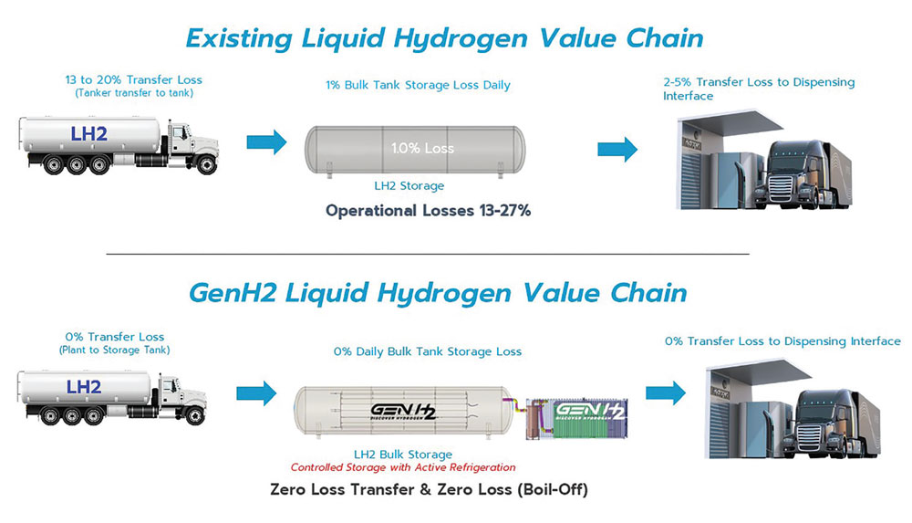 Recently, GenH2 debuted zero-loss hydrogen solutions that prevent evaporation and loss. The company’s controlled storage, zero-loss transfer systems were developed based on proof of concepts from NASA. By utilizing a refrigerated storage system, it ensures that liquid hydrogen remains in a subcooled state, by constantly removing heat from the molecule. That process prevents evaporation (boiloff), therefore eliminating the need for venting. This innovative approach not only prevents transfer losses during bulk tank fills but also eliminates daily storage losses and losses that occur during dispensing operations.